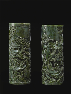 清乾隆碧玉透雕松山献瑞图大香筒一对 高24.7厘米,估价15万—25万美元